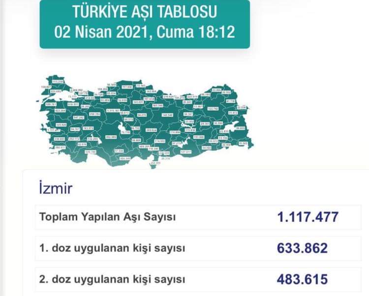 Paylaşımda, İzmir’de 1 milyon 117 bin 477 adet aşı yapıldığı; 1 doz uygulanan kişi sayısının 633 bin 862, 2’nci doz uygulanan kişi sayısının ise 483 bin 615 olduğu belirtildi.