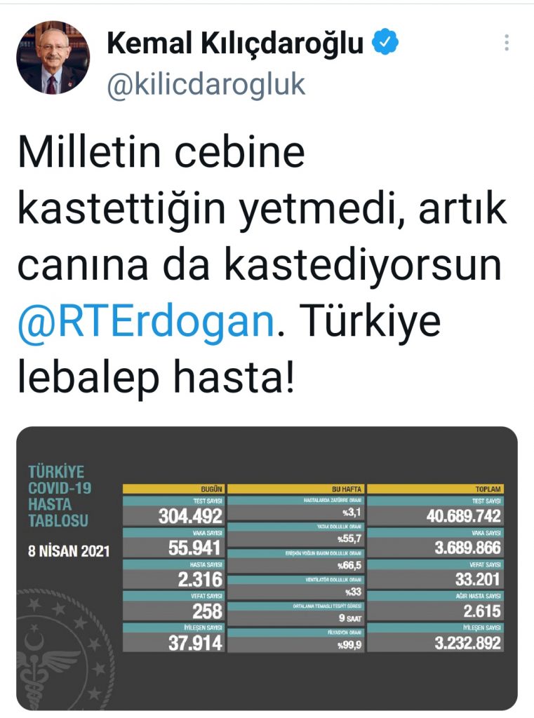 Sosyal medya hesabından açıklama yapan Kılıçdaroğlu, sürekli artış eğiliminde olan Korona ile ilgili Sağlık Bakanlığı’nın güncel tablosunu paylaşarak Cumhurbaşkanının milletin canına kastettiğini iddia etti.