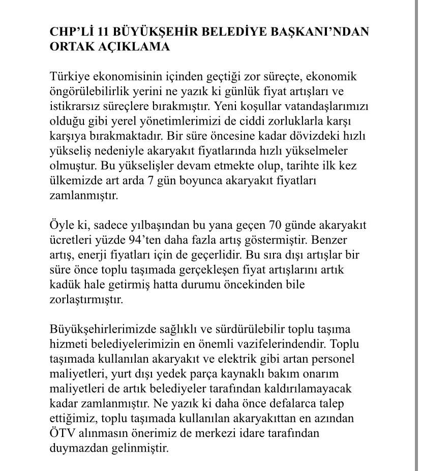 Öyle ki yılbaşından bu yana geçen 70 günlük süreçte akaryakıt fiyatları yüzde 94 artmıştır. Benzer artış enerji fiyatları için de geçerlidir. Bu sıradışı artışlar bir süre önce toplu taşımada gerçekleşen fiyat artışlarını artık kadük hale getirmiş hatta daha öncekinden daha zorlaştırmıştır.”