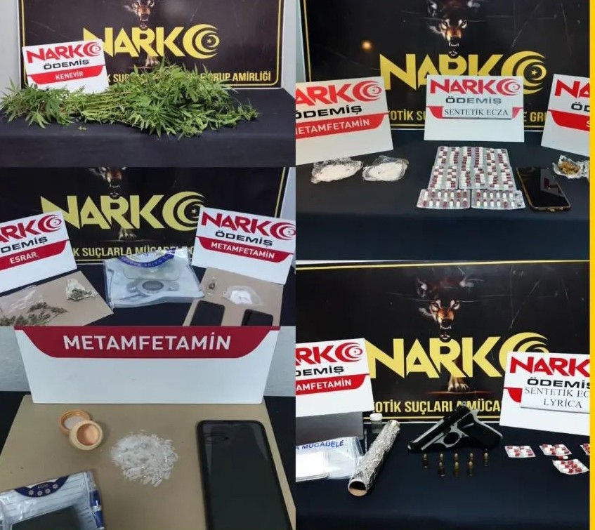 Ödemiş Emniyet müdürlüğü tarafından yapılan operasyonlar sonucunda şüpheli E.K., B.O., E.D., Ş.Ş., E.T., G.K., İ.N., V.D. 8 şahısa uyuşturucu ticareti yapmaktan işlem yapıldı. Operasyonda 3 adet terazi, 2 tabanca, 25 kök kenevir, 150 adet sentetik ecza ve çok sayıda satışa hazır vaziyette metamfetamin maddesi ele geçirildiği öğrenildi.